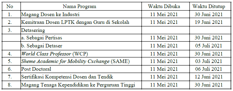 Bagi dosen dan tenaga kependidikan di Perguruan Tinggi Akademik yang berminat untuk mengikuti kegiatan tersebut dapat mendaftar melalui laman: kompetensi.sumberdaya.kemdikbud.go.id/v2, dengan batas waktu pendaftaran sesuai dengan masing-masing program. Persyaratan peserta dan jadwal pelaksanaan program, dapat lihat pada pedoman masing-masing program yang dapat di unduh pada laman: kompetensi.sumberdaya.kemdikbud.go.id/v2.
