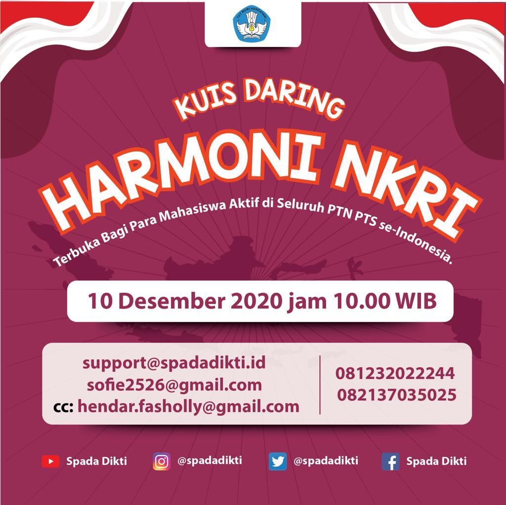 Sehubungan dengan itu, kami mohon kepada Bapak/ Ibu pimpinan perguruan tinggi di indonesia dapat ikut bemartisipasi dengan mengajak para mahasiswanya untllk mengikuti kuis danng (online) dengan tema "Harmoni NKRI". Kuisi ini diselenggamkan dalam rangka menyelenggarakan pengujian LMS yang dikembangkan. Infonnasi lebih lanjut terkait kuis ini dapat diperoleh melalui poster yang ada pada lampiran dari surat ini. Demikian pemberitahuan ini kami sampalkan.