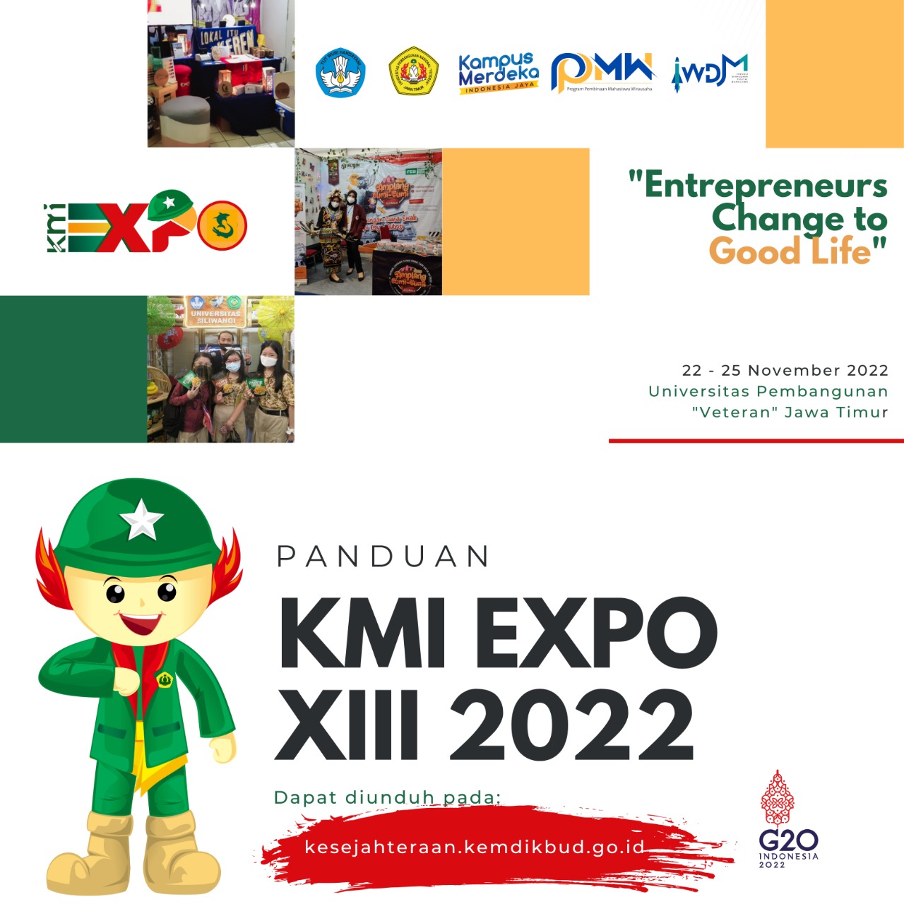 Direktorat Pembelajaran dan Kemahasiswaan, Ditjen Diktiristek bekerjasama dengan Universitas Pembangunan Nasional "Veteran" Jawa Timur akan melaksanakan Kewirausahaan Mahasiswa Indonesia (KMI) Expo XIII 2022 yang akan dilakasanakan pada tanggal 22-25 November 2022 di Universitas Pembangunan Nasional "Veteran" Jawa Timur.
